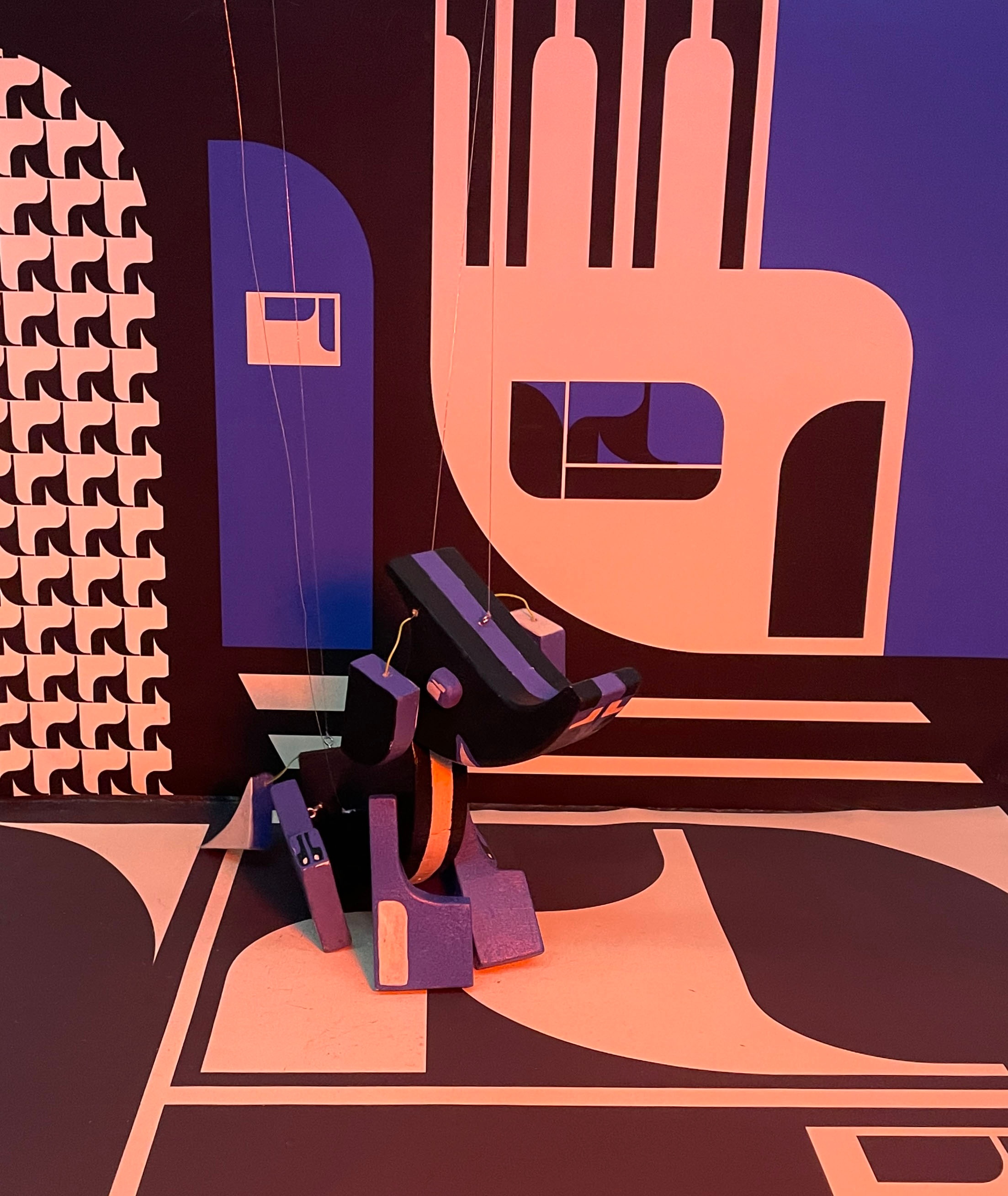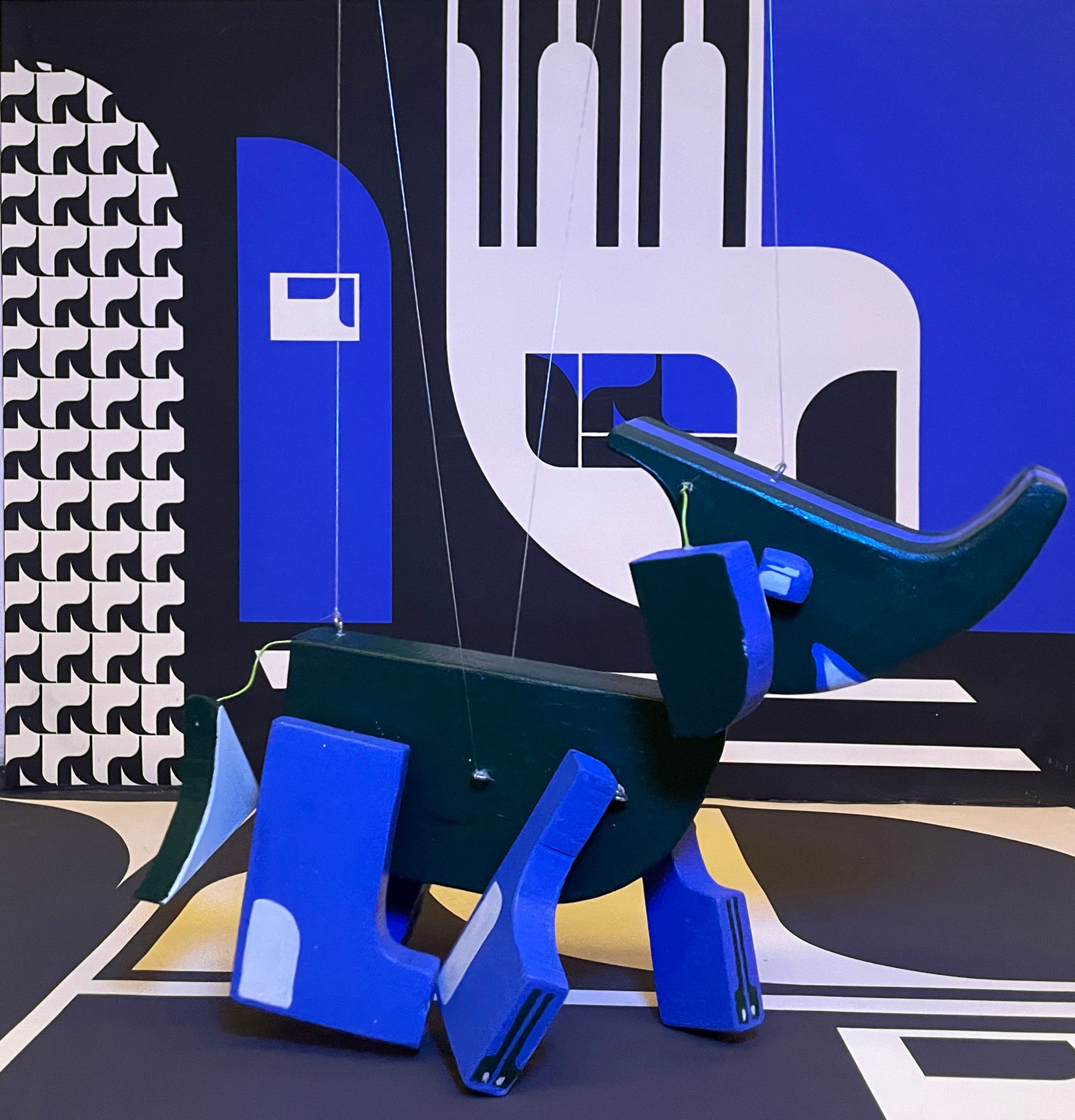 Puppet: Scrap bin lumber, acrylic paint, fishing line, screw eyes, wire 5 by 13 by 10 inches April 2022