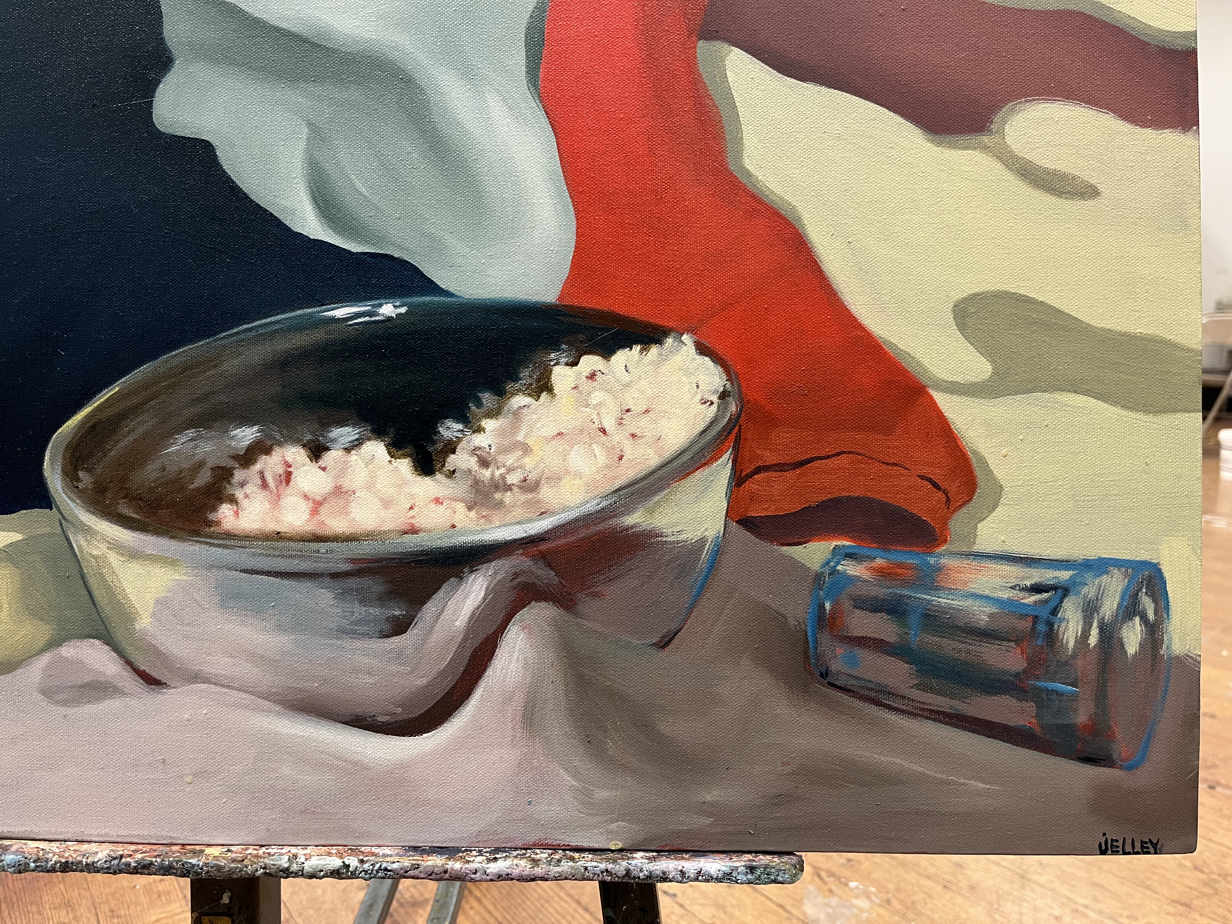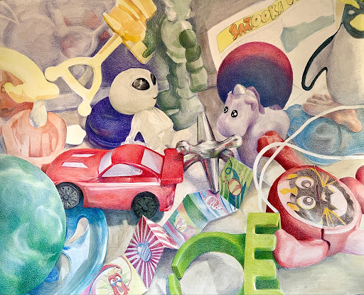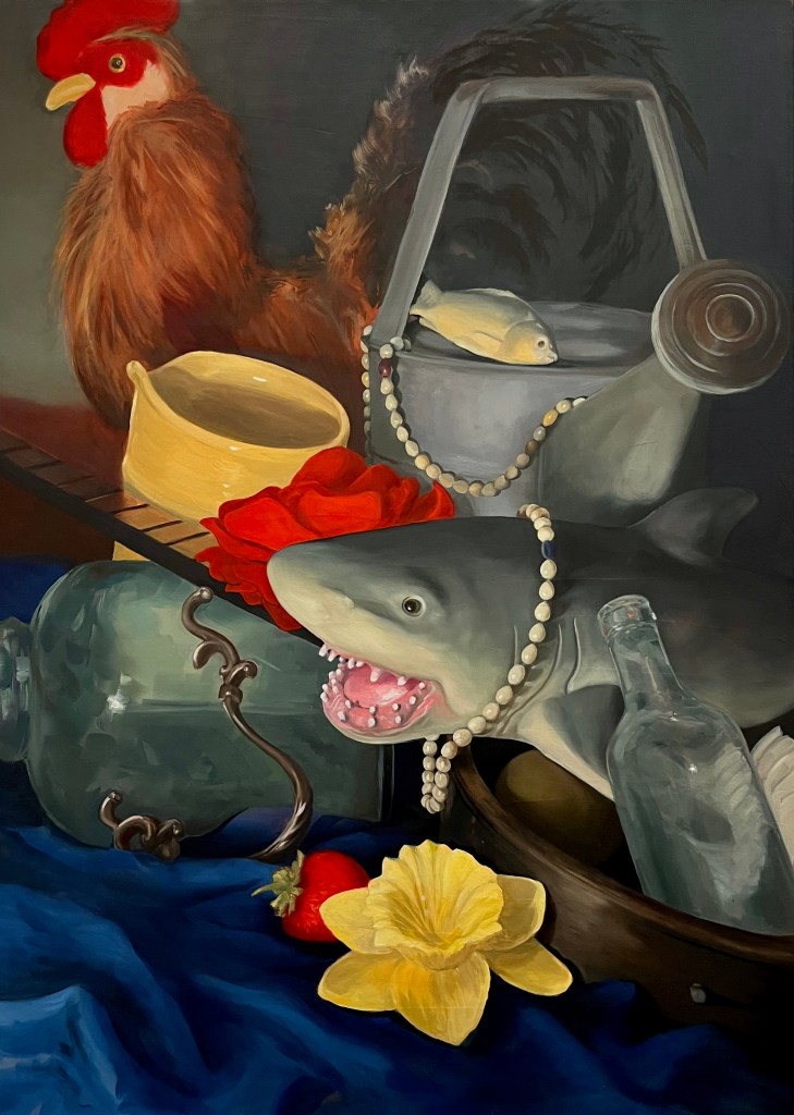 I used to feel like still lifes were really bland and uptight, just a way to get in some technical and observation practice. But the silliness of this model shark kept me entertained while working on this piece. For still lifes that aren’t formally playful, it just made sense to add some humor to the subject itself.