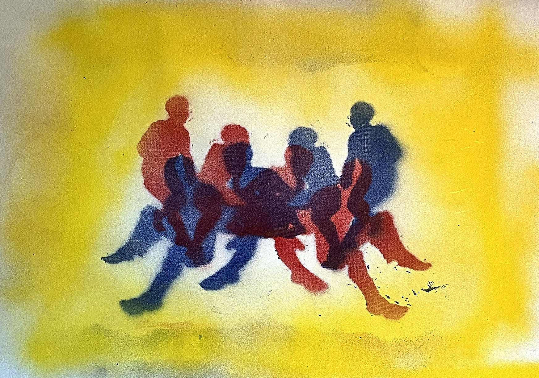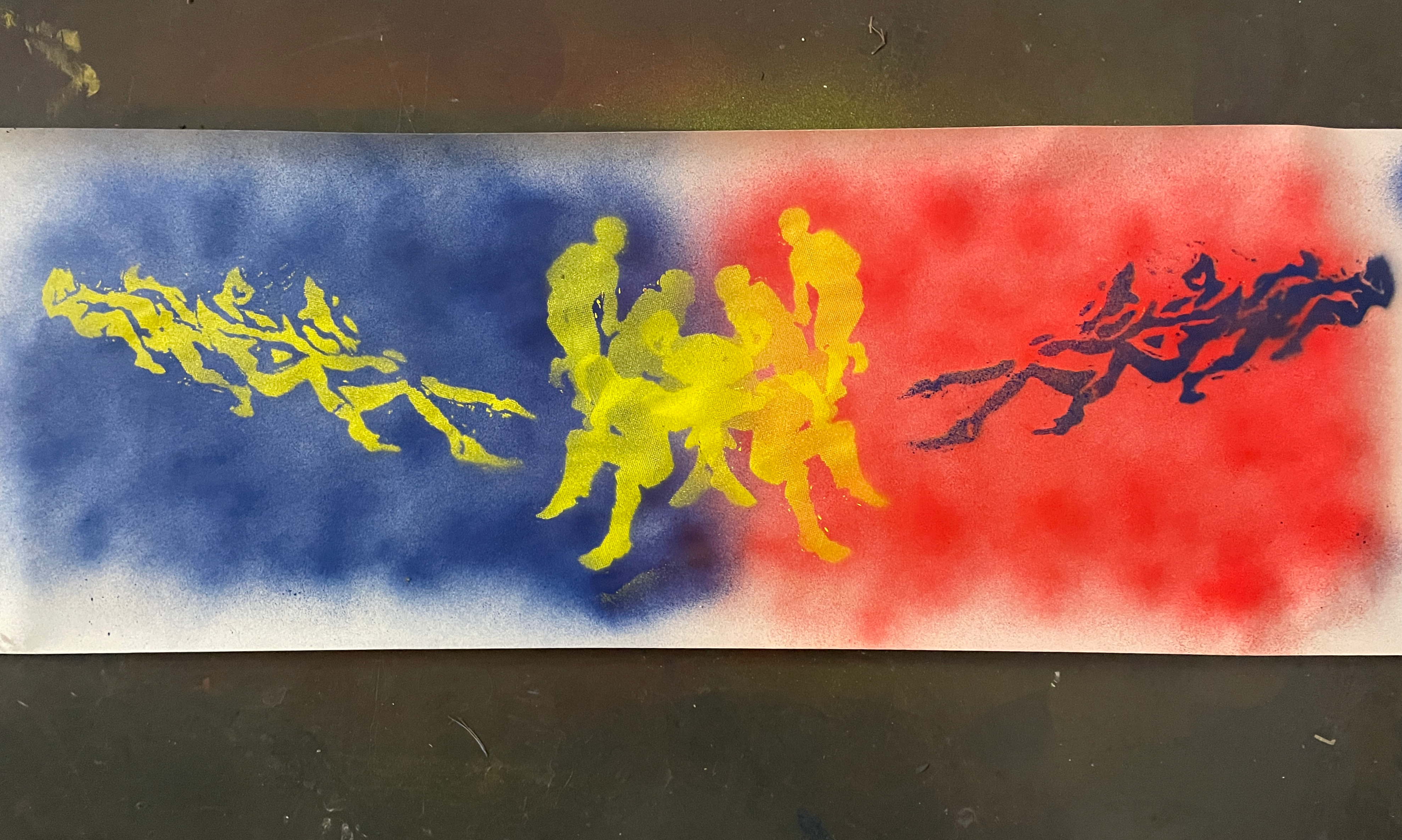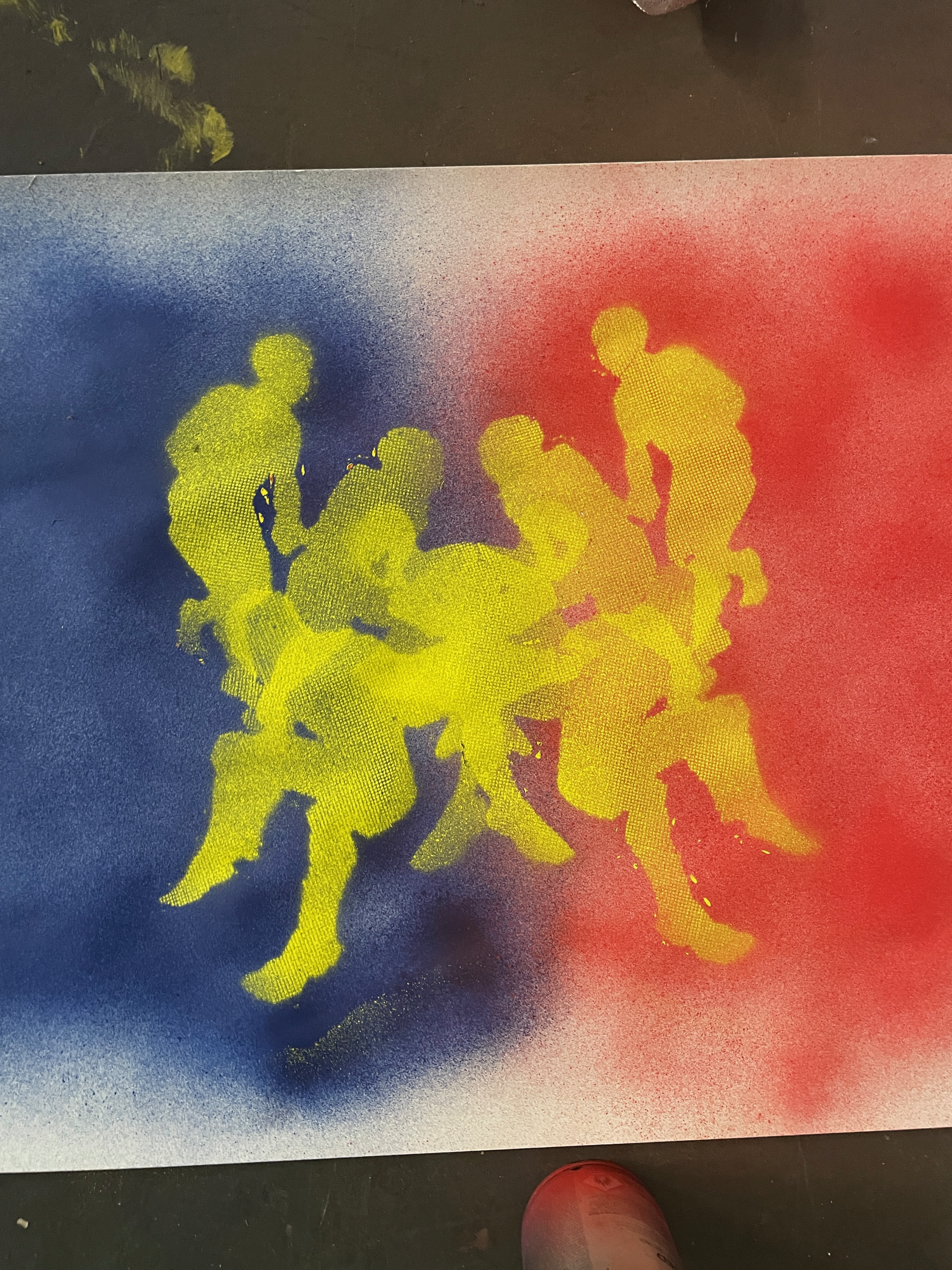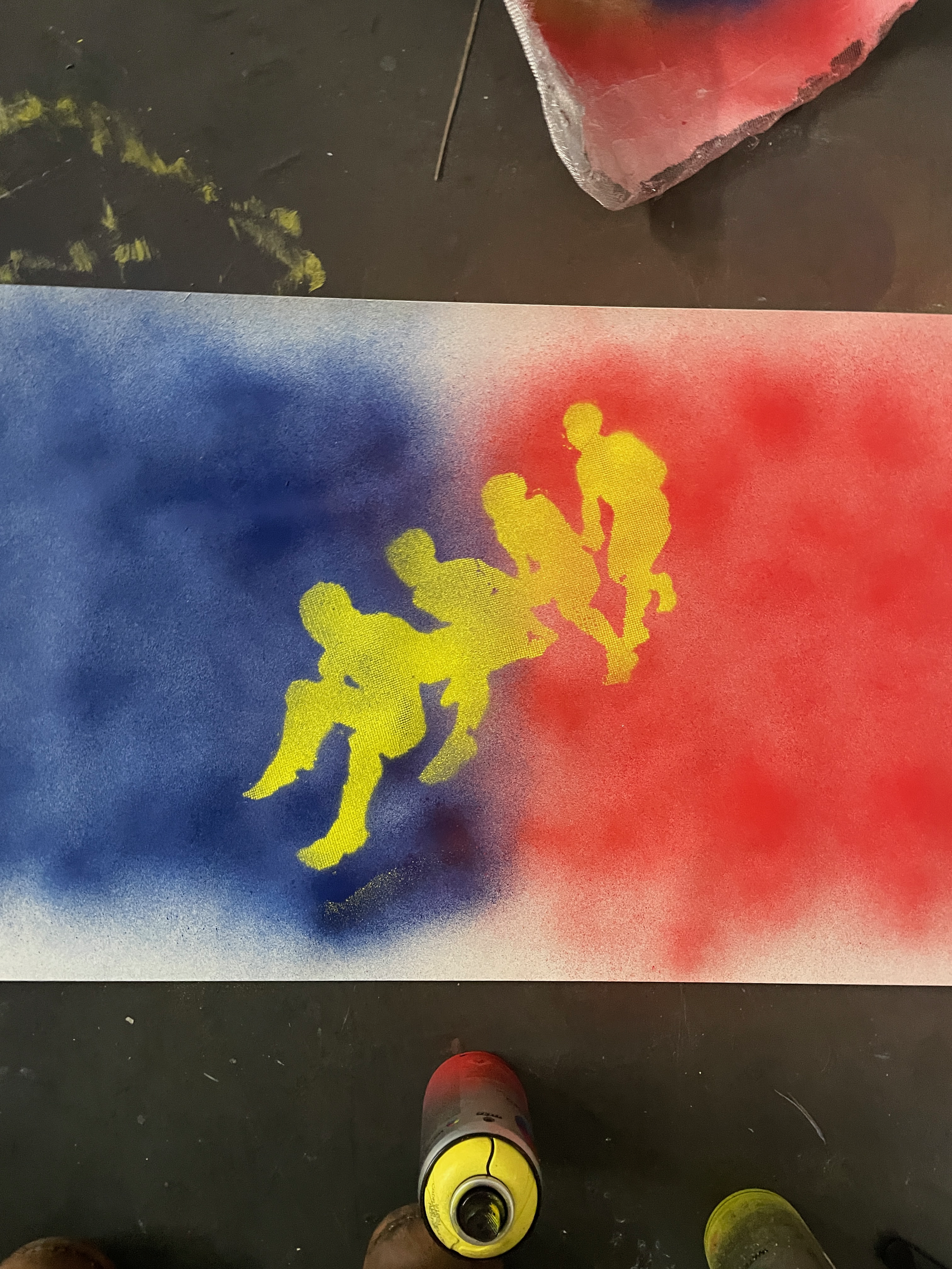 This started as a sculpture project, melded into a multi-figure drawing in gridded perspective, then the drawings became silhouette outlines for a set of washable stencils. I work with spray paint and stencils a bunch, usually carving them out from paper. But using paper means they warp and collect dirt as soon as you use them once. So I used window screen scraps, caulk, hot glue, and tape to assemble something more like silkscreen but for spraypaint. The use of wire mesh let me layer colors with a half-tone effect, allowing me to create new shapes and colors with limited supplies.