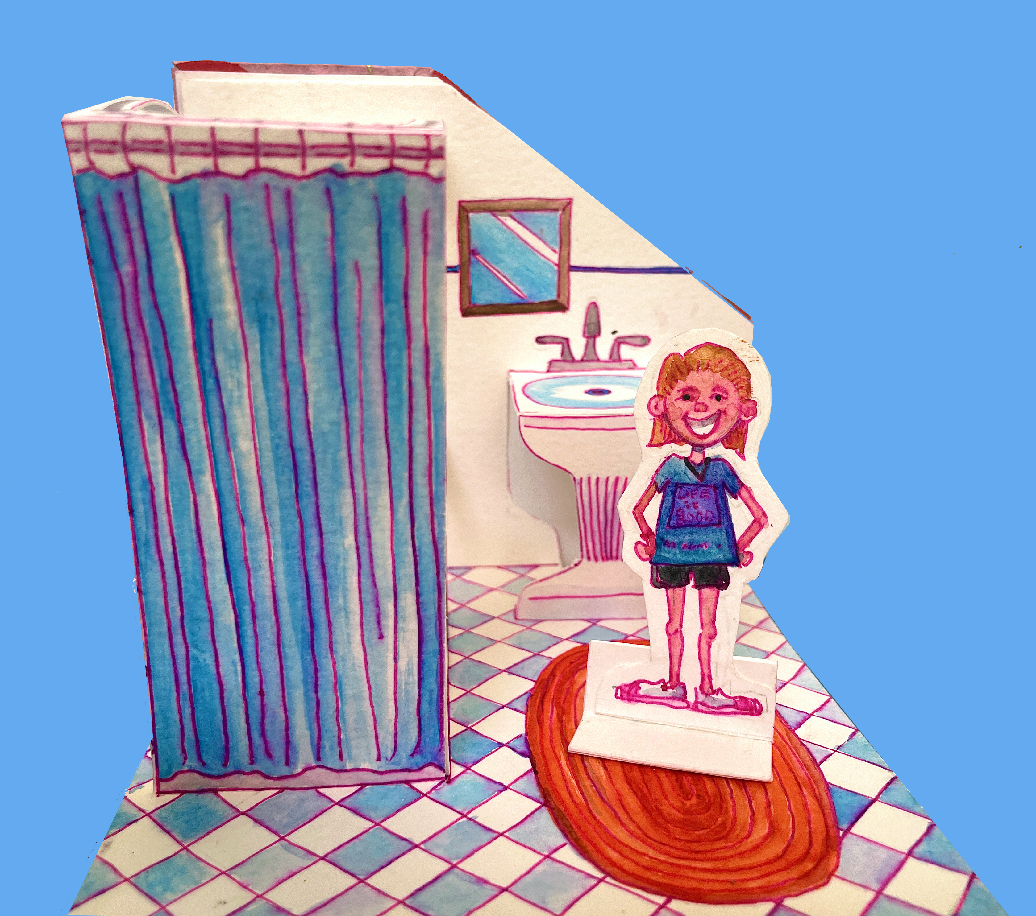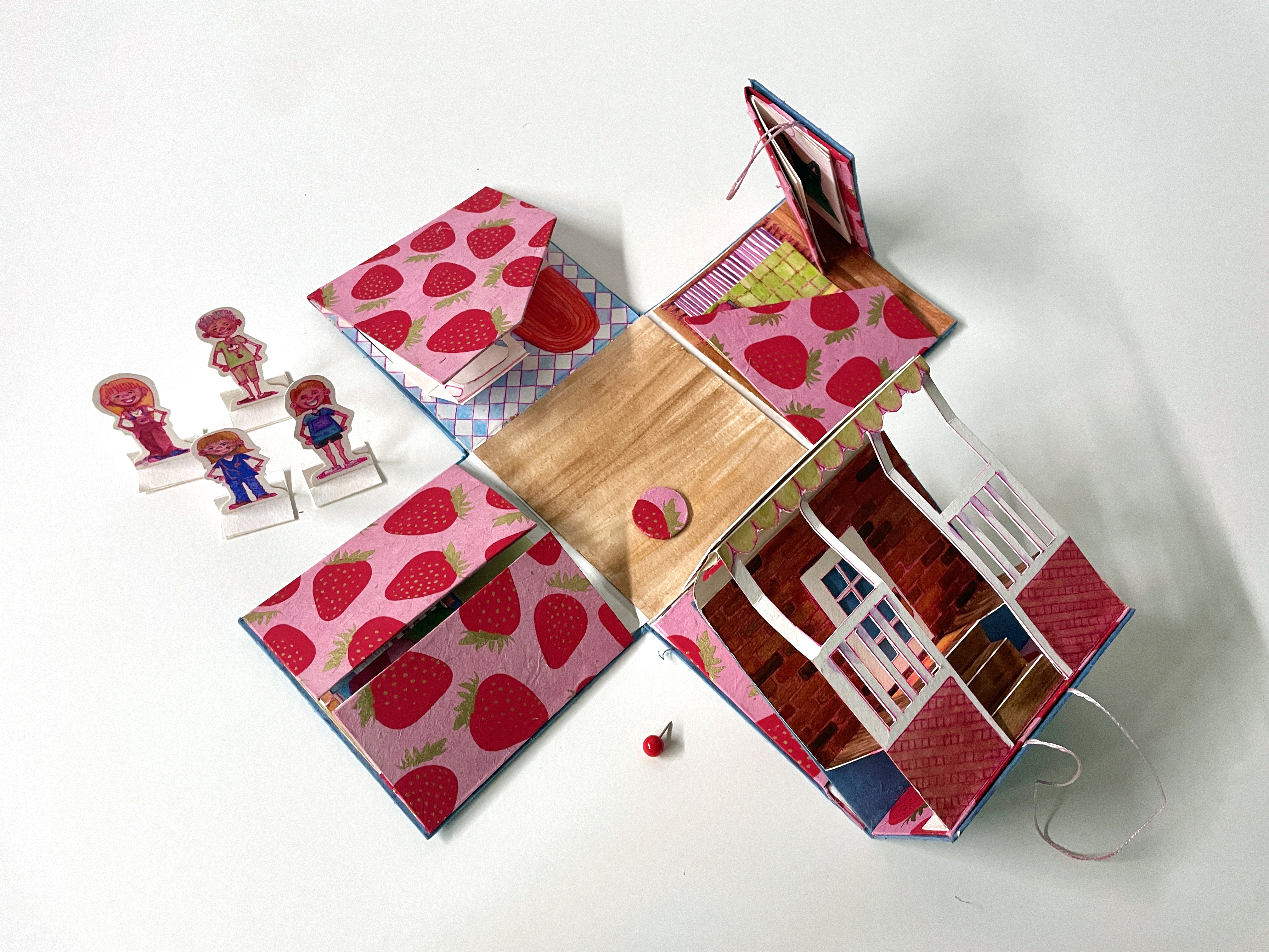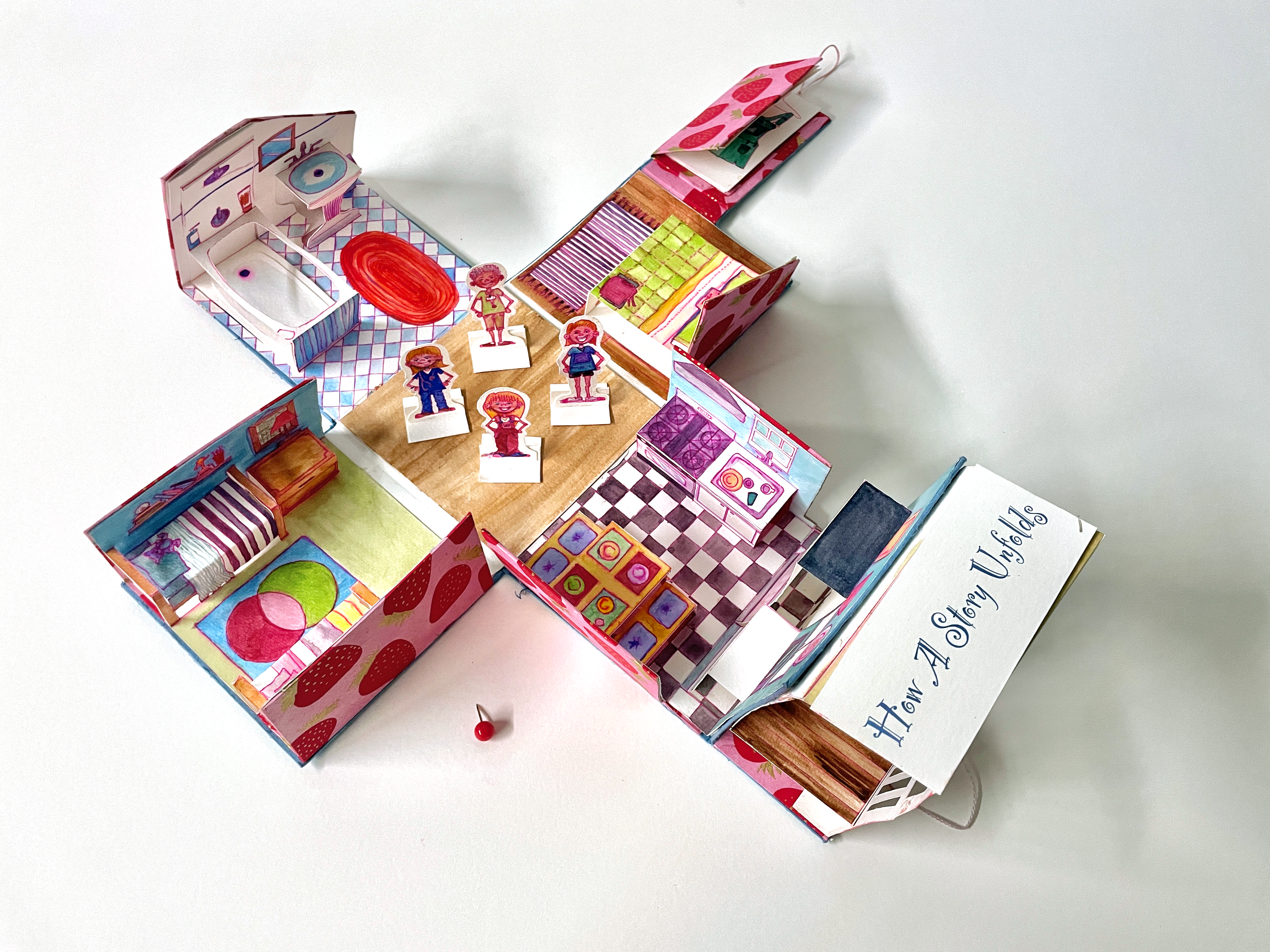 Cardboard, cardstock, ink, colored pencil, watercolor, tape, glue-stick 9 by 9 by 9 inches while folded up March 2022